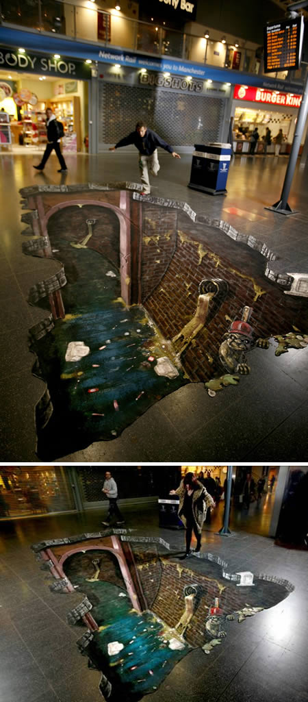 When viewed from certain angles, Beever's intricately detailed chalk sketches create a convincing impression of depth on the flat surface of paving stones. From other perspectives, however, his drawings appear strangely distorted and bear little resemblance to their intended image. To construct his illusions, Beever, originally from Melton Mowbray in Leicestershire, uses a lens to help him manipulate the image on the flat surface to appear more realistic.